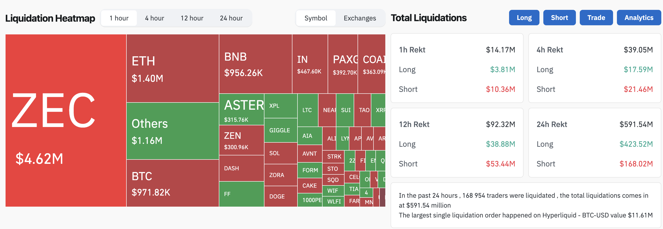 За минувшие сутки биткоин подешевел примерно на $4 000, вызвав волну ликвидаций на рынке криптовалют. За последние 24 часа были ликвидированы позиции на общую сумму более $500 млн, при этом на долю длинных позиций пришлось более 70% от общего объема ликвидаций ($424 млн). Самый крупный ордер — на $11 млн в паре BTC-USD — был ликвидирован на платформе Hyperliquid.