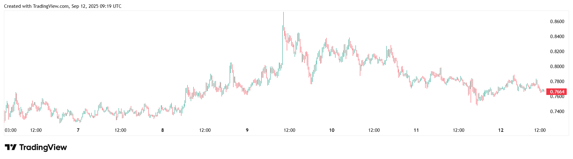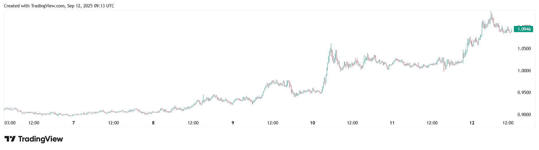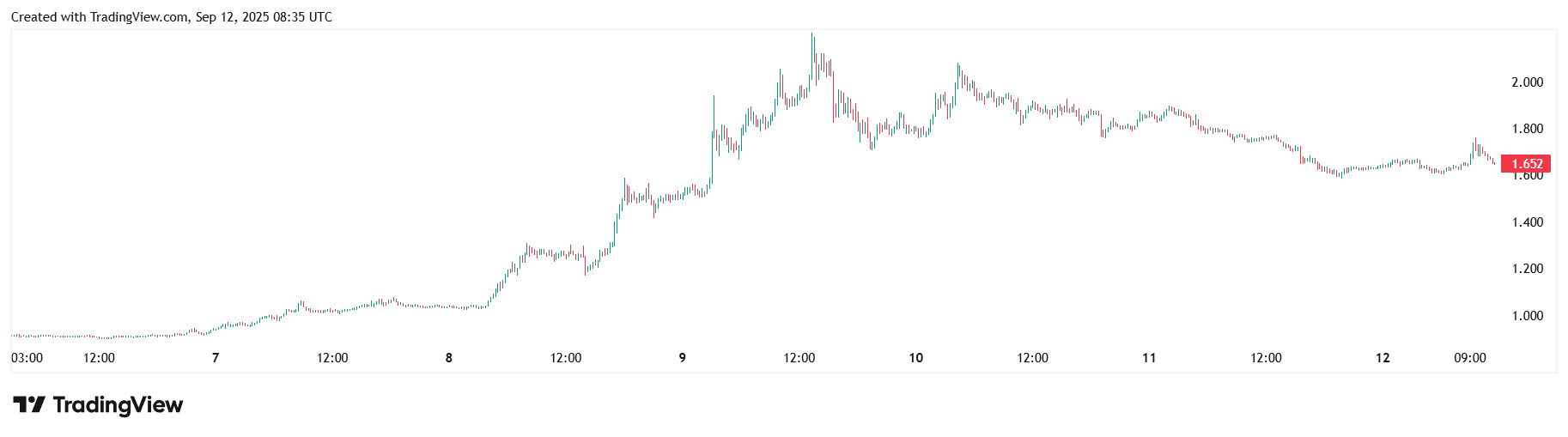 Токен WLD проекта World (Ранее Worldcoin) продемонстрировал резкий скачок на более чем 90%. Как видно на графике, он произошел 8-9 сентября 2025 года, после чего актив торговался в боковике.