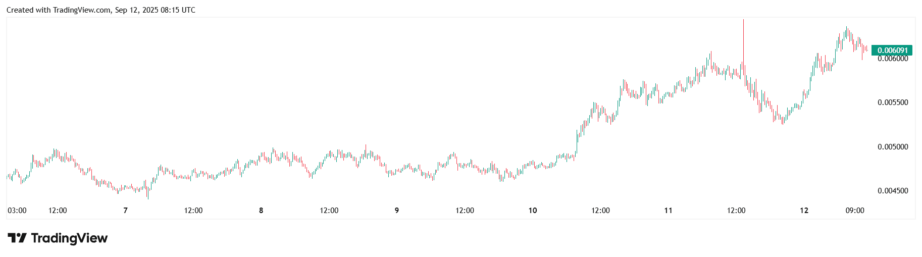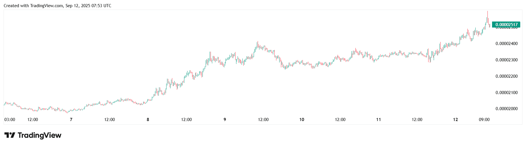 Ценовой график BONK выглядит аналогичным образом. Прирост за неделю составляет почти 30%. В этом случае рост обусловлен также рядом факторов.