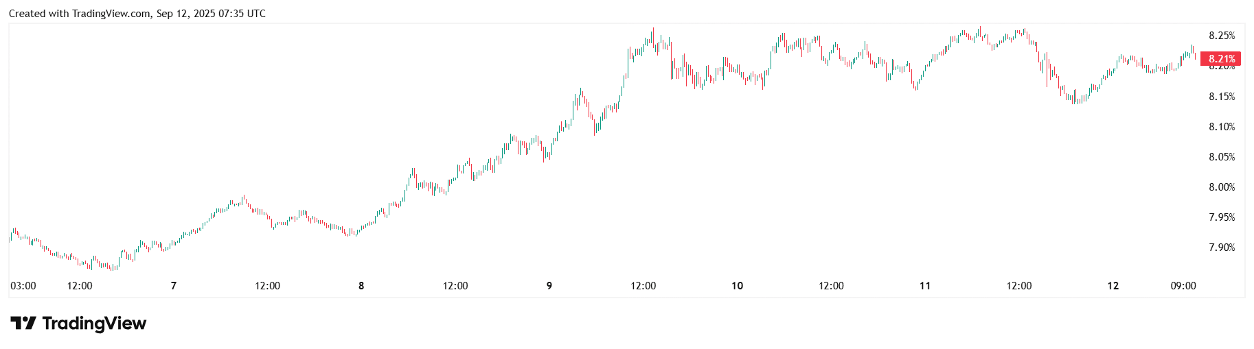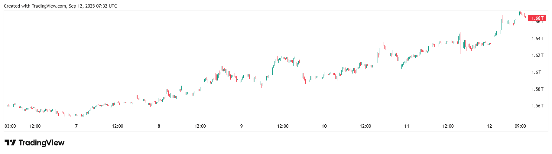 Капитализация сектора альткоинов, за исключением биткоина, составляет $1,66 трлн. На недельном чарте прирост достиг 7,6%, на месячном — 3%.