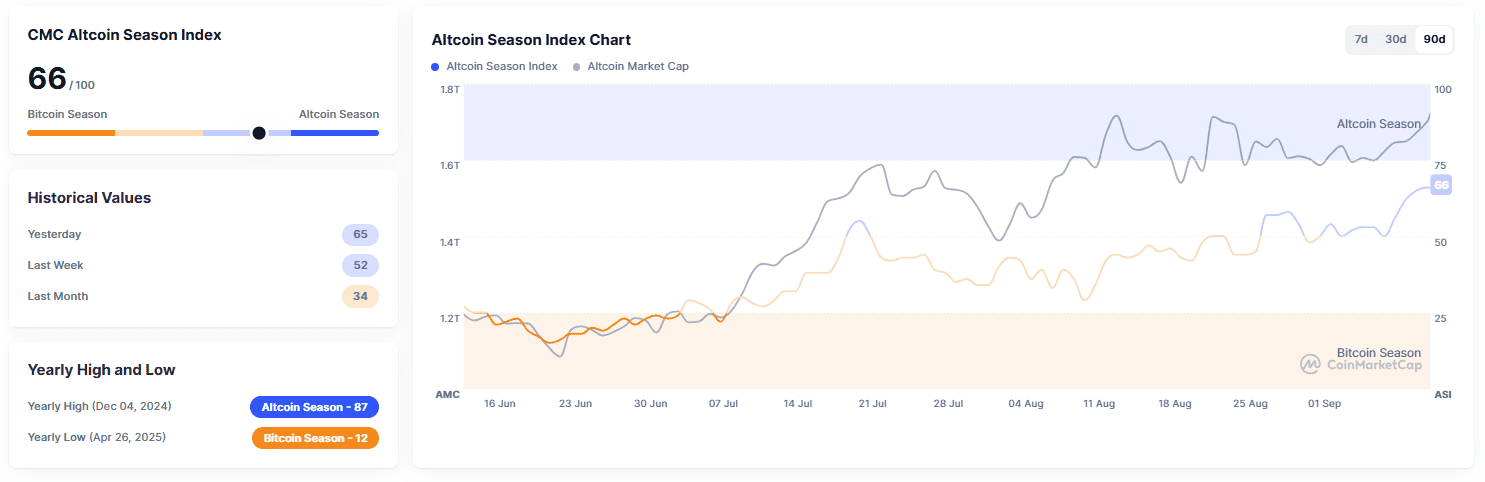 Индекс альтсезона от портала CoinMarketCap указывает на значение в 66 пунктов. Это меньше порогового значения в 75, однако рост индикатора (13 пунктов за неделю и 31 за месяц) указывает на положительную динамику: