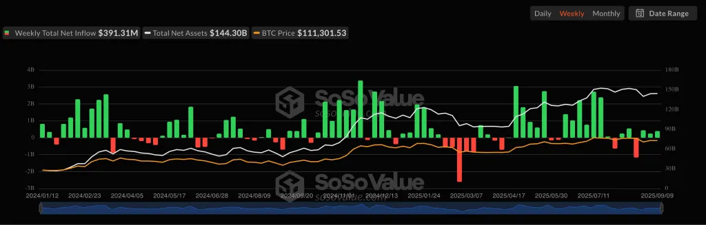 Недельные притоки и оттоки по спотовым биткоин-ETF. Источник: SoSoValue.