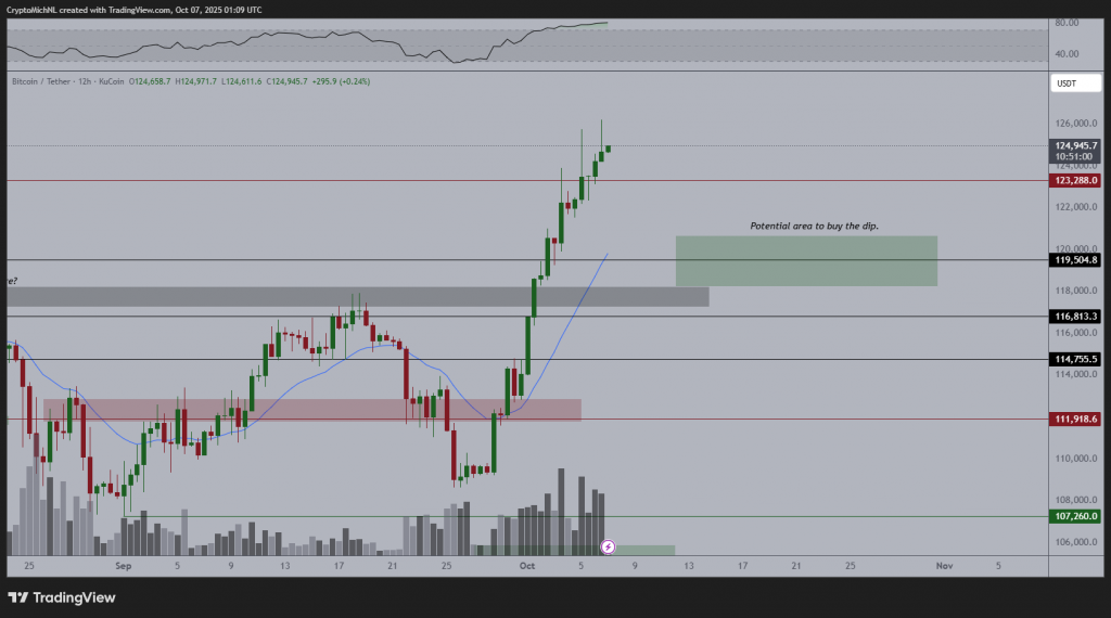 Криптотрейдер и аналитик Михаэль ван де Поппе (Michaël van de Poppe) отмечает, что биткоин консолидируется вблизи исторического максимума, готовясь к продолжению роста в направлении $150 000. В случае коррекции оптимальной точкой входа он считает уровень ниже $121 000.
