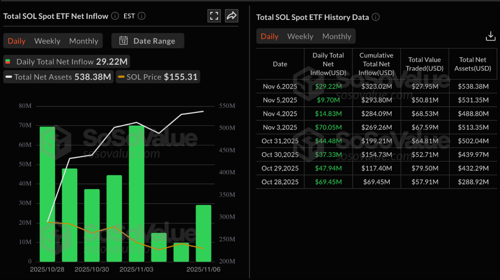 Притоки в спотовые Solana-ETF наблюдаются восьмой день подряд — $29 млн за прошедший день торгов. Всего с момента запуска в эти инструменты поступило $323 млн.