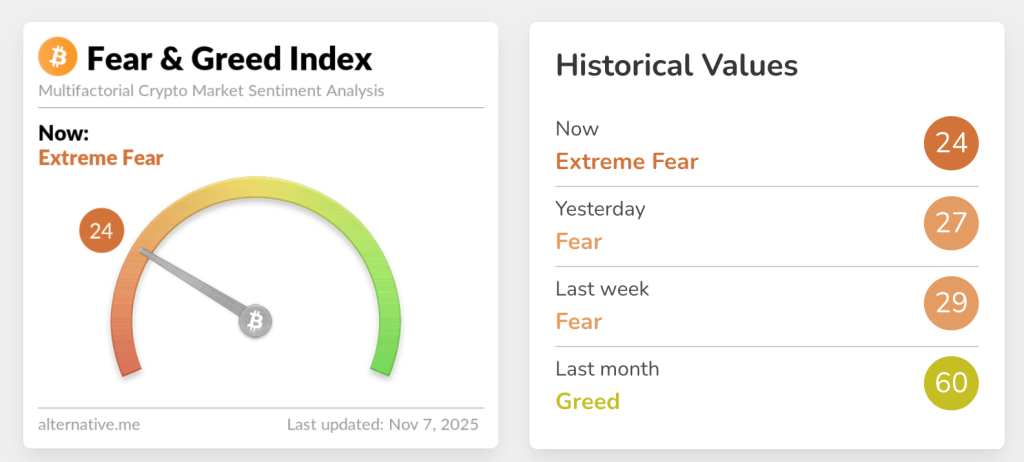 Криптовалютный индекс страха и жадности находится на отметке 24 — зона «экстремального страха».