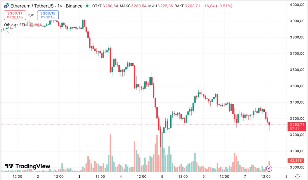 Цена Ethereum снизилась на 4,6% за последние сутки, а за семь дней — на 15,7%. На момент написания вторая по капитализации криптовалюта торгуется около $3200.