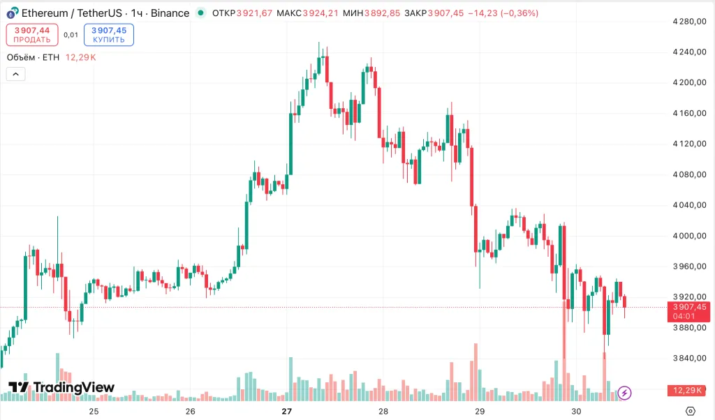 Помимо биткоина, позитивную динамику показал Ethereum. Курс ведущего альткоина кратковременно вырос до $4000, но затем снизился до ~$3900.
