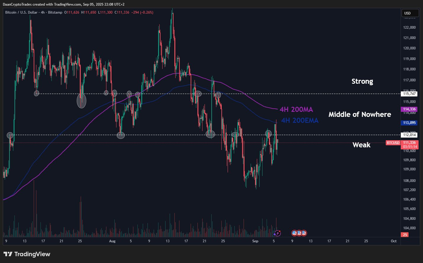 Трейдер Daan Crypto Trades обратил внимание на 200-периодные простую и экспоненциальную скользящие средние на четырехчасовом графике, которые находятся в районе $113 000-$114 000. «Сейчас торговля идет прямо под 4-часовыми 200MA/EMA. Их нужно будет пробить, чтобы ситуация изменилась в краткосрочной перспективе», — пояснил он.