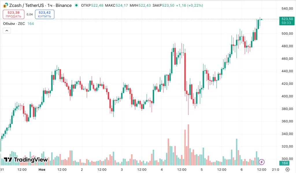За последние сутки криптовалюта Zcash подорожала на 20,6%. На момент написания ZEC торгуется около $520 — максимальный уровень с 2018 года.