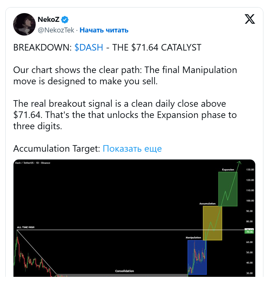 Ранее аналитики указывали на $71,64 как на ключевой уровень сопротивления для DASH. Поскольку токен уже преодолел этот порог, это может открыть дорогу для продолжения роста к следующим психологическим рубежам около $100 и выше.