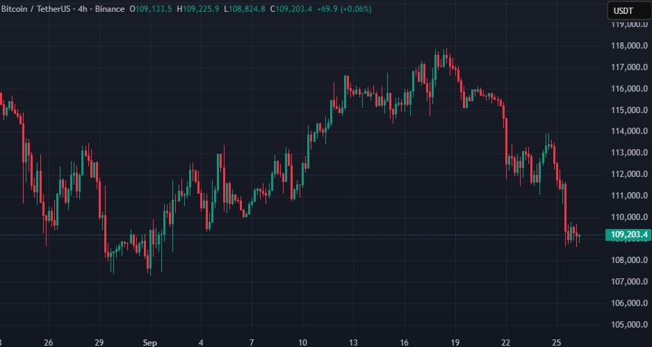 - 25 сентября биткоин обвалился ниже $109 000. Актив продолжает падение с начала недели.