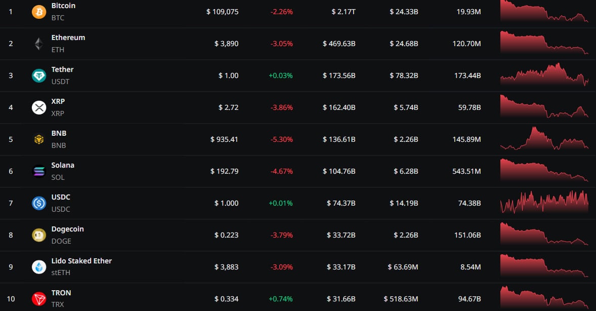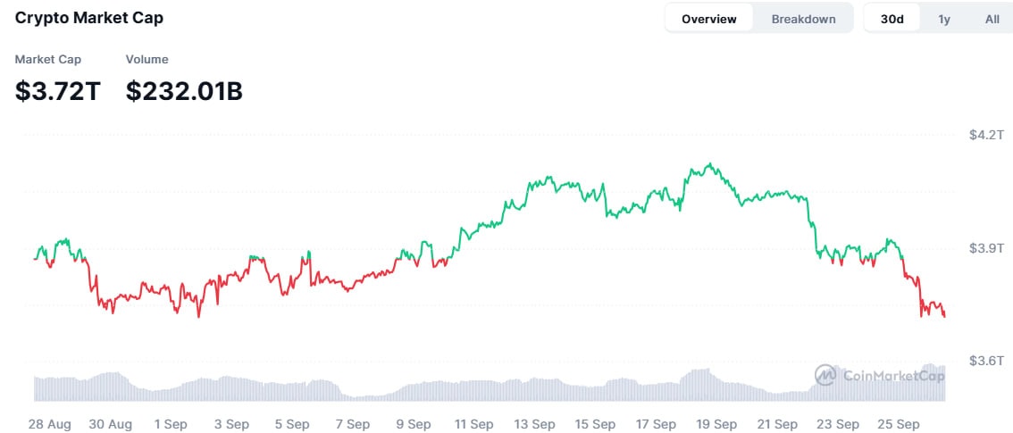 Капитализация криптовалютного рынка снизилась более чем на 5% и на момент написания составляет около $3,7 трлн.