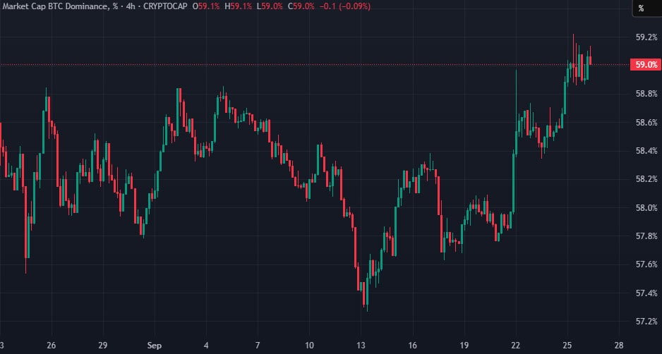 На фоне этого показатель доминирования первой криптовалюты растет. Он превысил отметку в 59% впервые за более чем месяц.