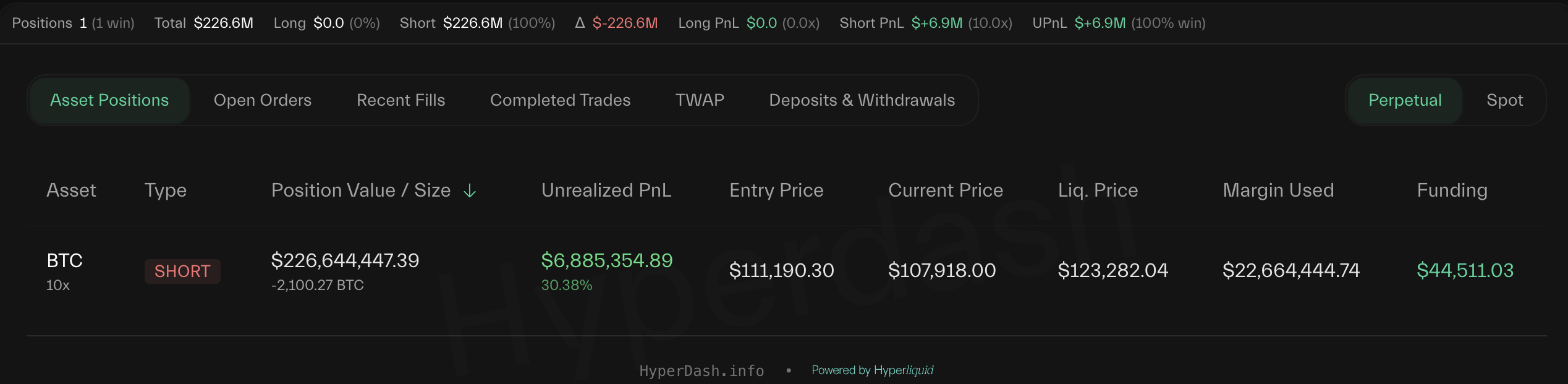 “Кит с $10 млрд на Hyperunit, который заработал $200 млн на коротких позициях во время обвала из-за тарифов Китая, только что УДВОИЛ свою короткую позицию по BTC,” Arkham опубликовал.