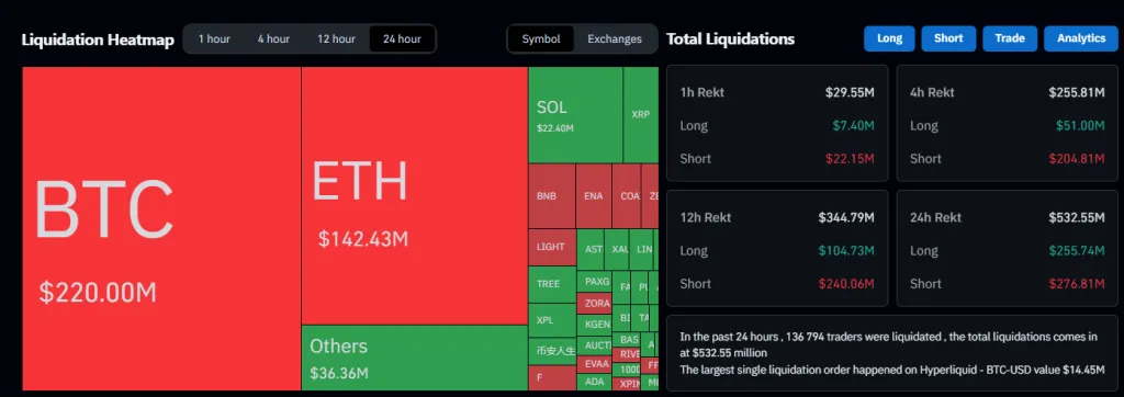 Объем ликвидаций за прошедшие сутки достиг $532 млн, разделившись почти поровну на лонги ($255 млн) и шорты ($276 млн). Однако в последние часы преобладают короткие позиции.