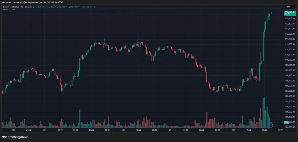 Вечером 21 октября первая криптовалюта стремительно преодолела отметку $113 000 после утреннего падения ниже $108 000. Монета за день прибавила 2,2%.
