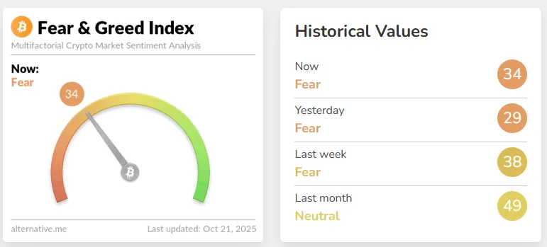 Криптовалютный индекс страха и жадности поднялся со вчерашних 29 до 34 баллов.