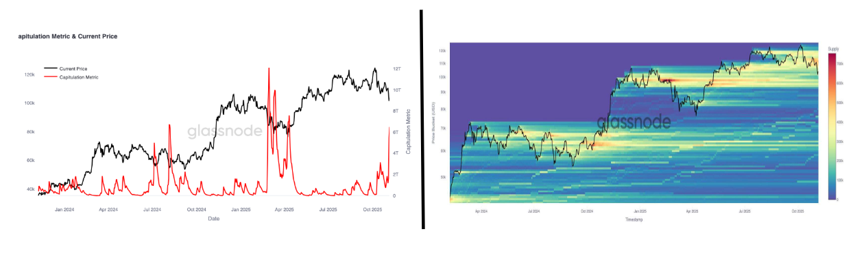 Метрика капитуляции биткоина и тепловая карта распределения базовой стоимости. Источник: Glassnode.