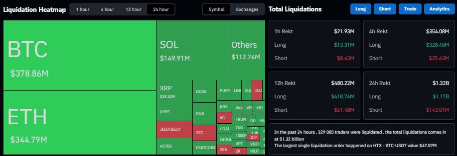 На фоне этого объем ликвидаций по фьючерсам на рынке криптовалют превысил отметку в $1,32 млрд за 24 часа.