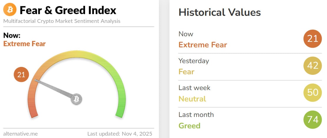 Индекс страха и жадности достиг значения в 21 пункт, что указывает на «экстремальный страх» трейдеров. За последние 24 часа показатель упал на 21 пункт, а за месяц — на 53.