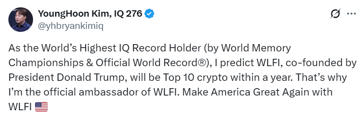 «Как обладатель мирового рекорда по уровню IQ, по версии World Memory Championships и Official World Record, я предсказываю, что токен WLFI проекта, соучредителем которого выступил президент Дональд Трамп, войдет в топ-10 криптовалют в течение года. Именно поэтому я являюсь официальным послом WLFI. Сделаем Америку великой снова с WLFI».