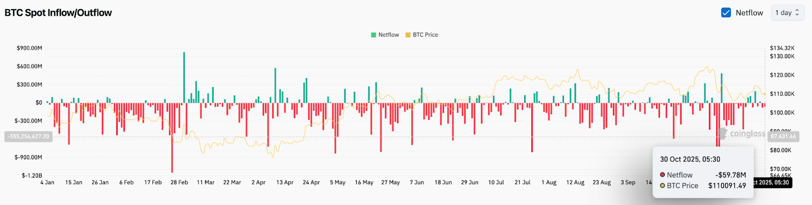 Этот шаг был предпринят на фоне того, что институциональная активность становится более осторожной. Данные спотового рынка Coinglass показывают чистый отток средств в размере 59,7 млн долларов США 30 октября, что является продолжением двухнедельного периода снижения ликвидности. Аналитики отмечают, что сочетание фиксации прибыли и макроэкономической неопределенности подготовило почву для очередного тестирования ключевого технического уровня поддержки вблизи отметки $109 000.