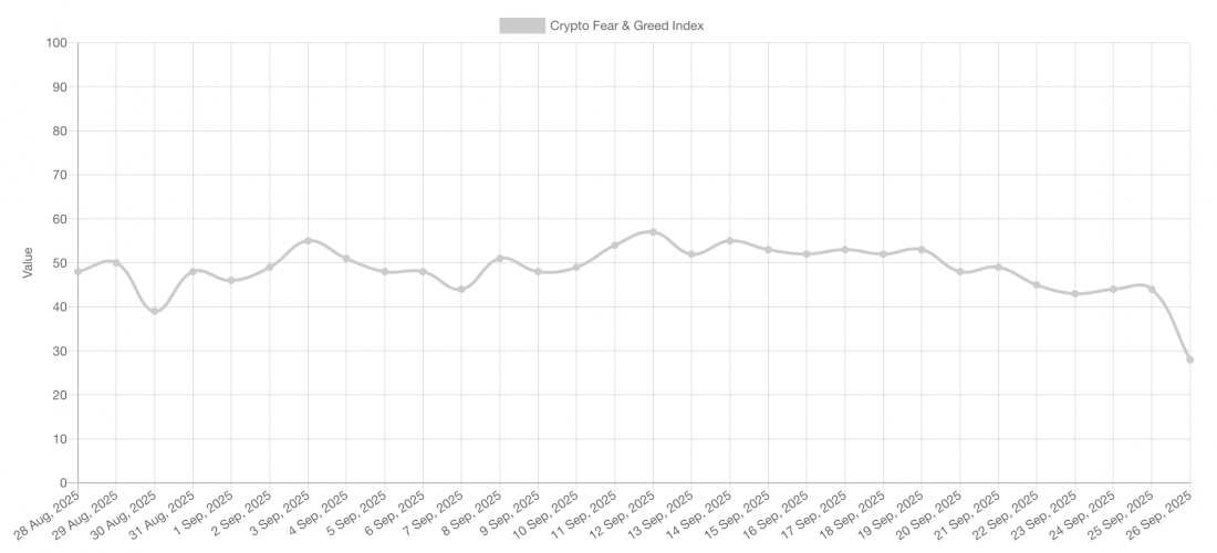 25 сентября настроения на крипторынке резко ухудшились на фоне очередного падения цены биткоина. Индекс страха и жадности криптовалютного рынка, который отслеживает эмоциональный фон инвесторов, упал до отметки 28 из 100 — это самое низкое значение с 11 апреля. За один день индекс потерял 16 пунктов, переместившись в зону «страха».