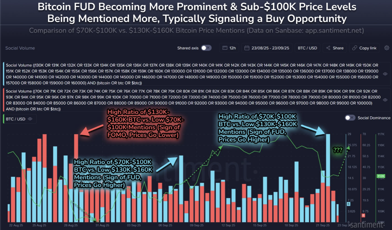 Рост страха на рынке и упоминаний цены ниже $100 000 указывают на возможность покупки. Источник: Santiment
