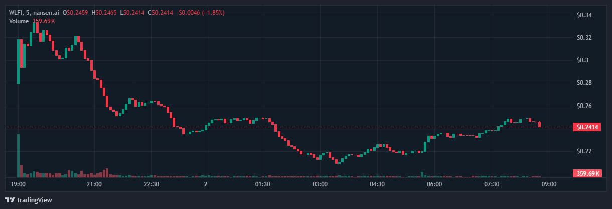 WLFI упал примерно на 36% с пикового значения в $0,331 до минимума в $0,210, прежде чем вернуться к торгам на уровне $0,229, снизившись почти на 30% за день на момент написания статьи.